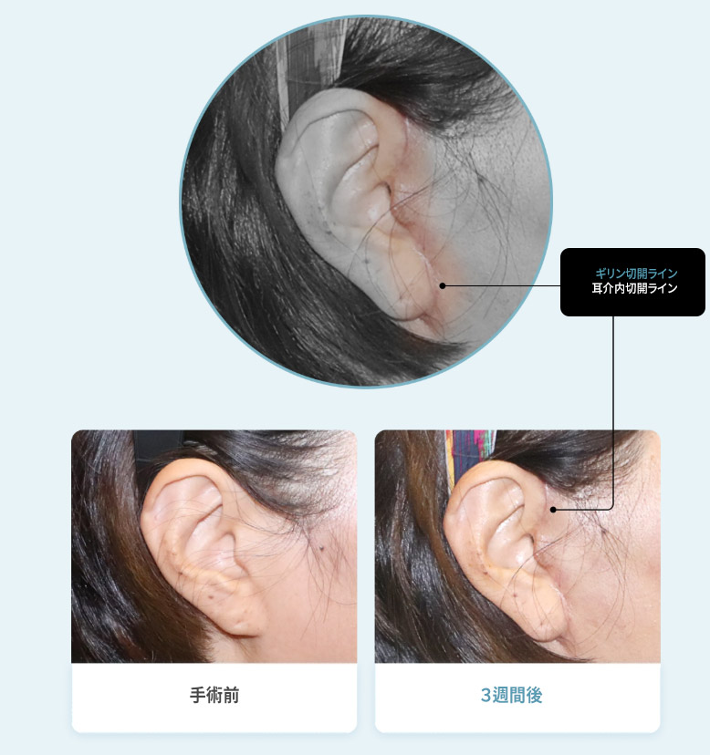 3 手術後の傷跡ギリン傷跡ケアシステムにより 傷跡が残らないように管理し、 耳介の内側から切開することで 傷跡が目立たなくなります。